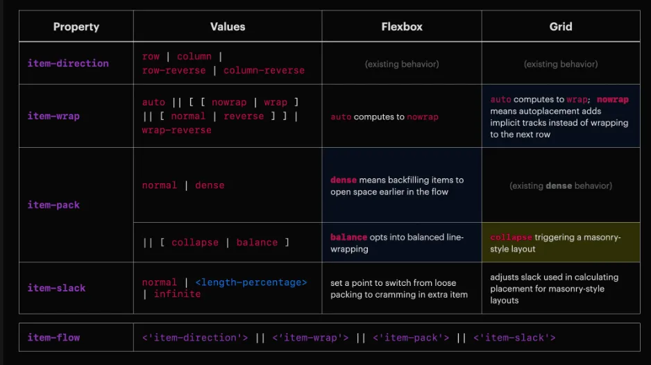 — там объясняется, откуда появился этот термин и почему CSS‑сообщество хочет заменить разрозненные свойства для разных моделей на единый набор. Вкратце напомню: идея ItemFlow состоит в том, чтобы определить общее направление размещения элементов, управление переносами, «упаковкой» и дополнительными настройками через набор новых свойств (item-direction, item-wrap, item-pack, item-slack), которые одинаково работают и во Flexbox, и в Grid, и в будущем Masonry. Такое объединение позволит флексам получить плотную упаковку, грядущим гриду — отключать перенос, а разработчикам — включать masonry‑раскладку без сторонних библиотек.