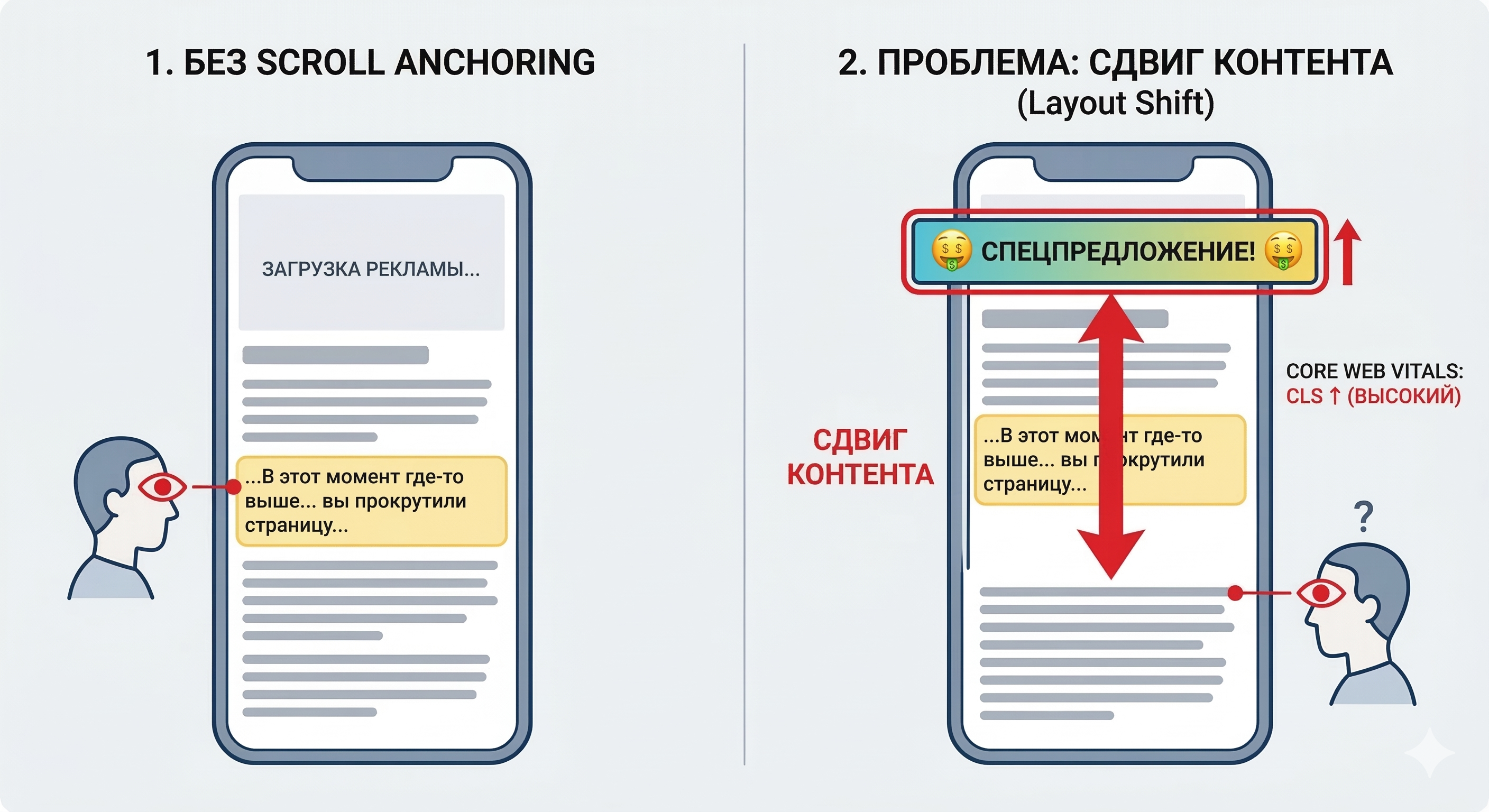 Представьте: вы прокрутили страницу до интересного абзаца и начали читать. В этот момент где-то выше, за пределами видимой области (вне вьюпорта), загружается баннер или изображение без заданных размеров. Браузер изменяет высоту блока, и весь контент под ним «уезжает» вниз. Вы теряете фокус чтения. Это называется Content Shift (сдвиг контента) и создает крайне негативный пользовательский опыт (CLS — Cumulative Layout Shift — является одним из ключевых метрик Core Web Vitals).